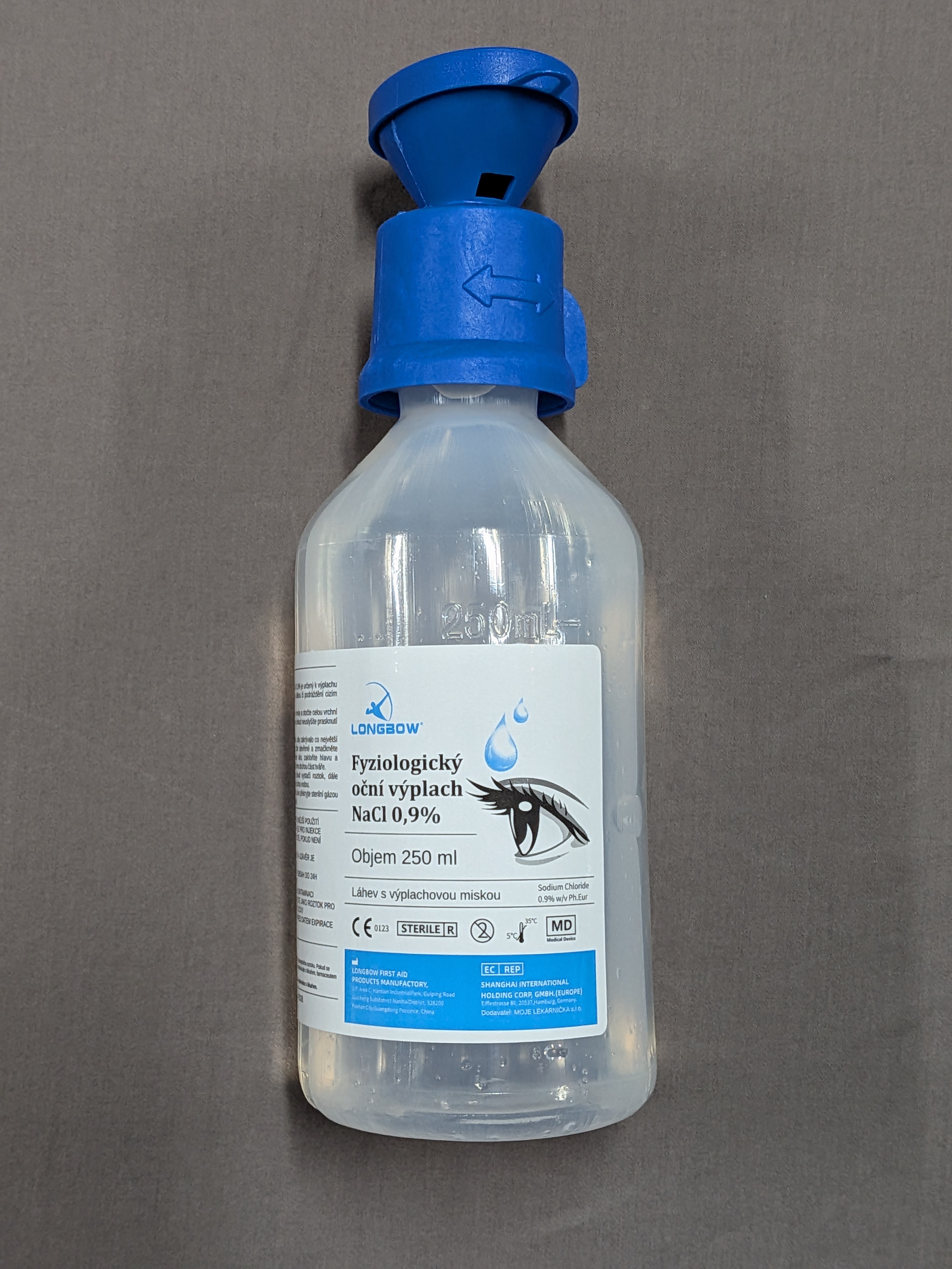 • fyziologický roztok NaCl 0,9%, určený na výplachu podráždených alebo poranených očí